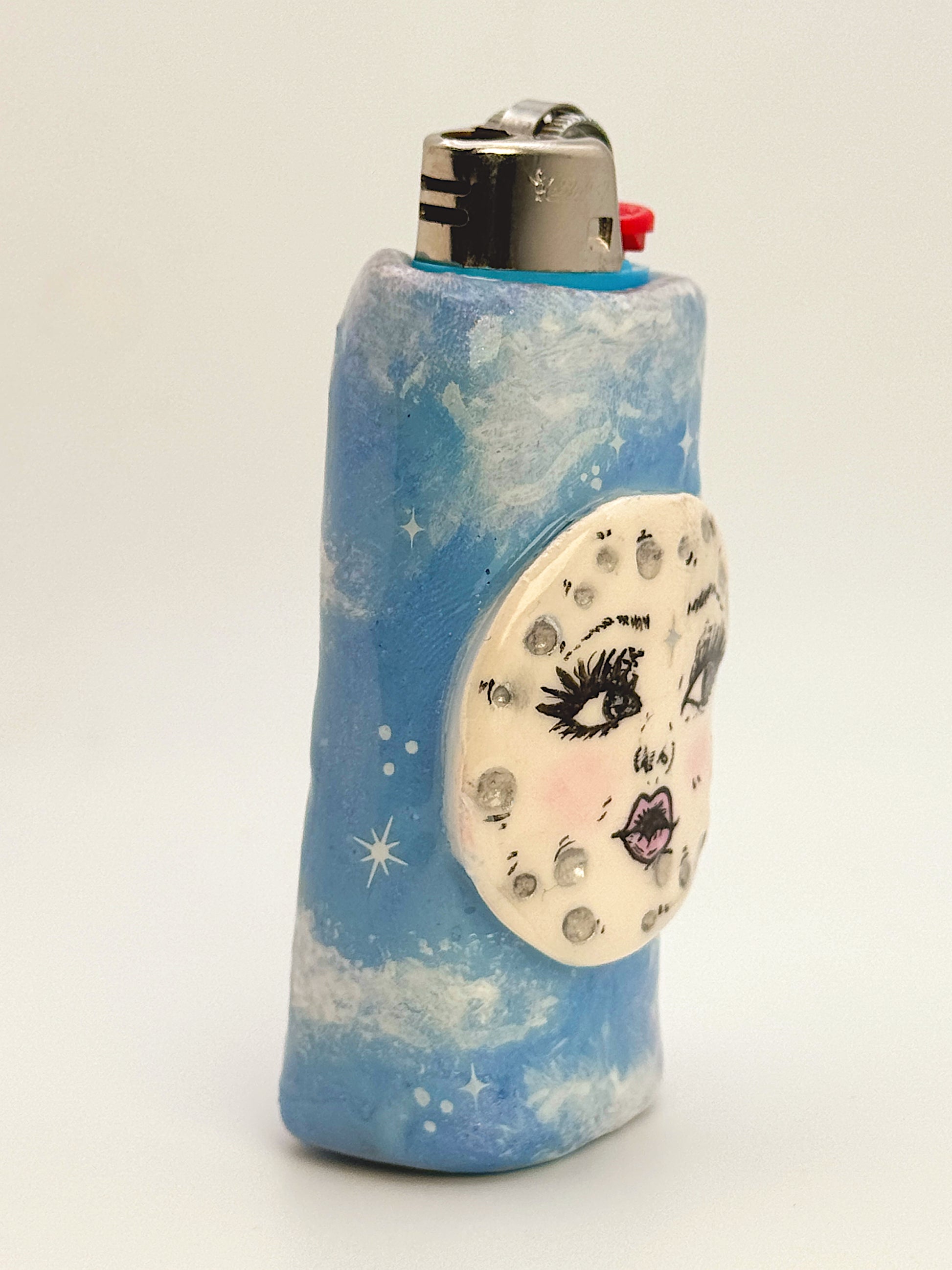 This hand-painted celestial moon lighter case features a sculpted moon face set against a dreamy blue sky with soft cloud textures and star details. Each case is carefully painted by hand and sealed for durability, making it both functional and collectible.