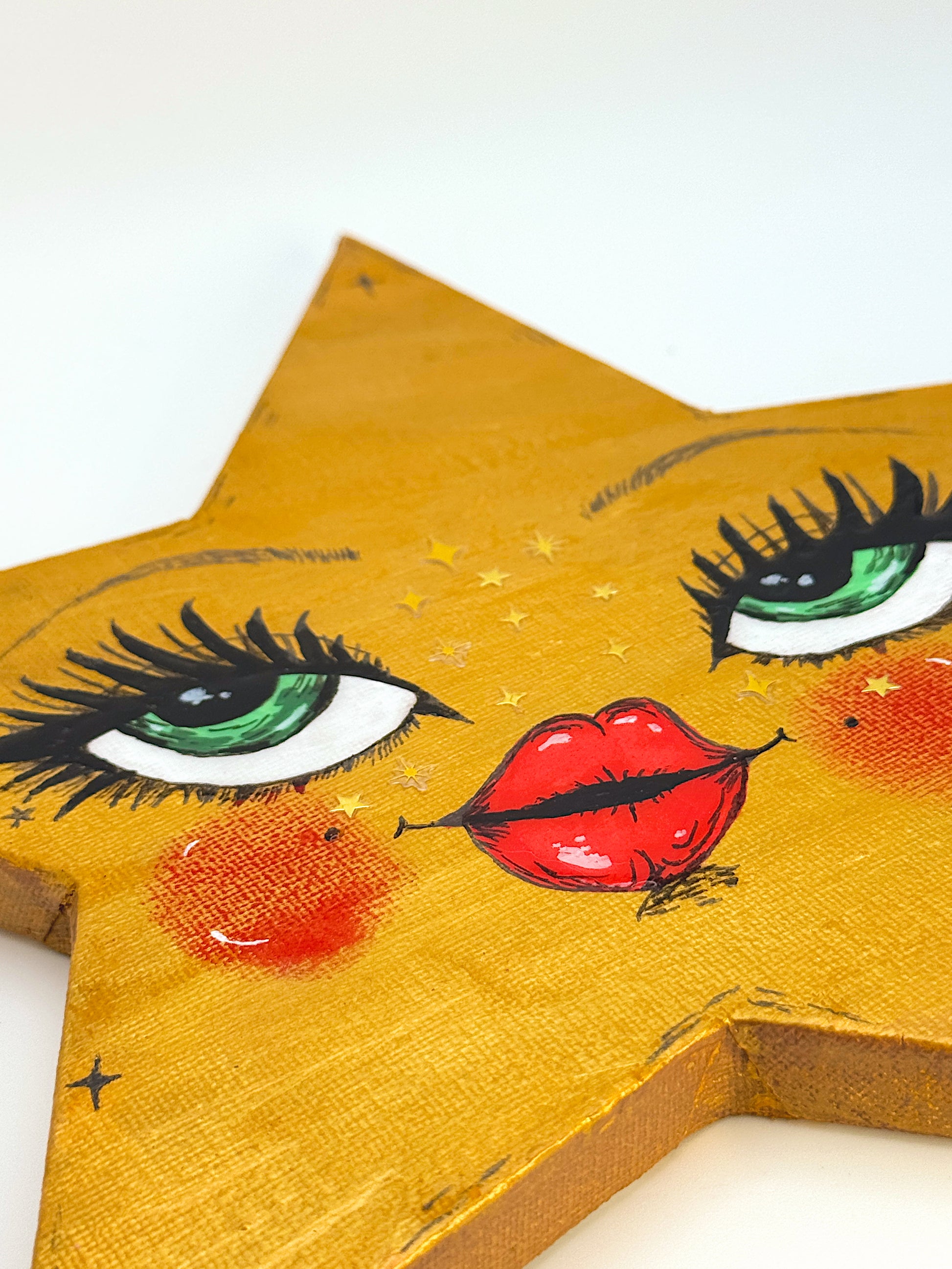 This golden 10x10 hand-painted star is ready to shine on your wall! Each piece is created start to finish by me — sketched, painted, detailed, and sealed with glossy UV-resin accents on the eyes, lips, and freckles for that dimensional “Bud & Bloom” sparkle. 🌟