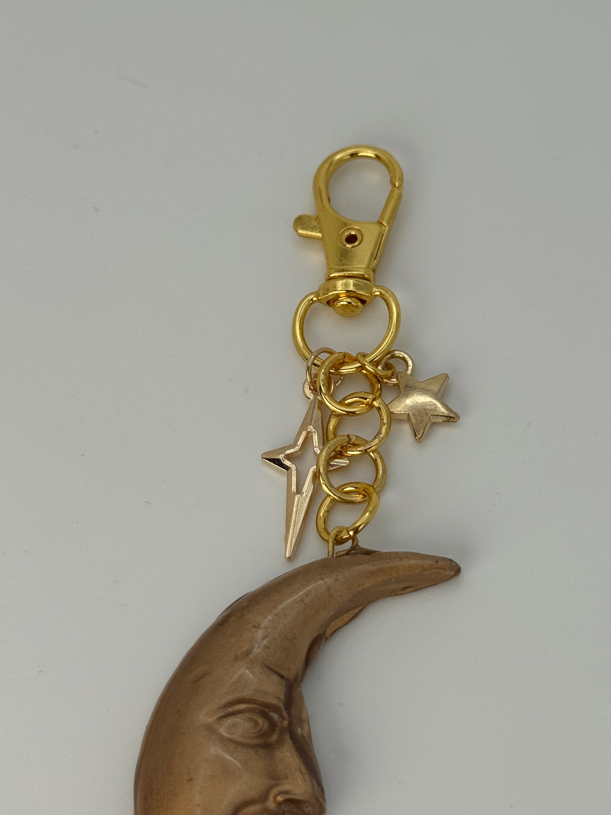 This piece features a sculpted gold-toned moon face paired with star charms and luxe gold hardware — perfect for clipping onto your keys, purse, tote, or backpack.