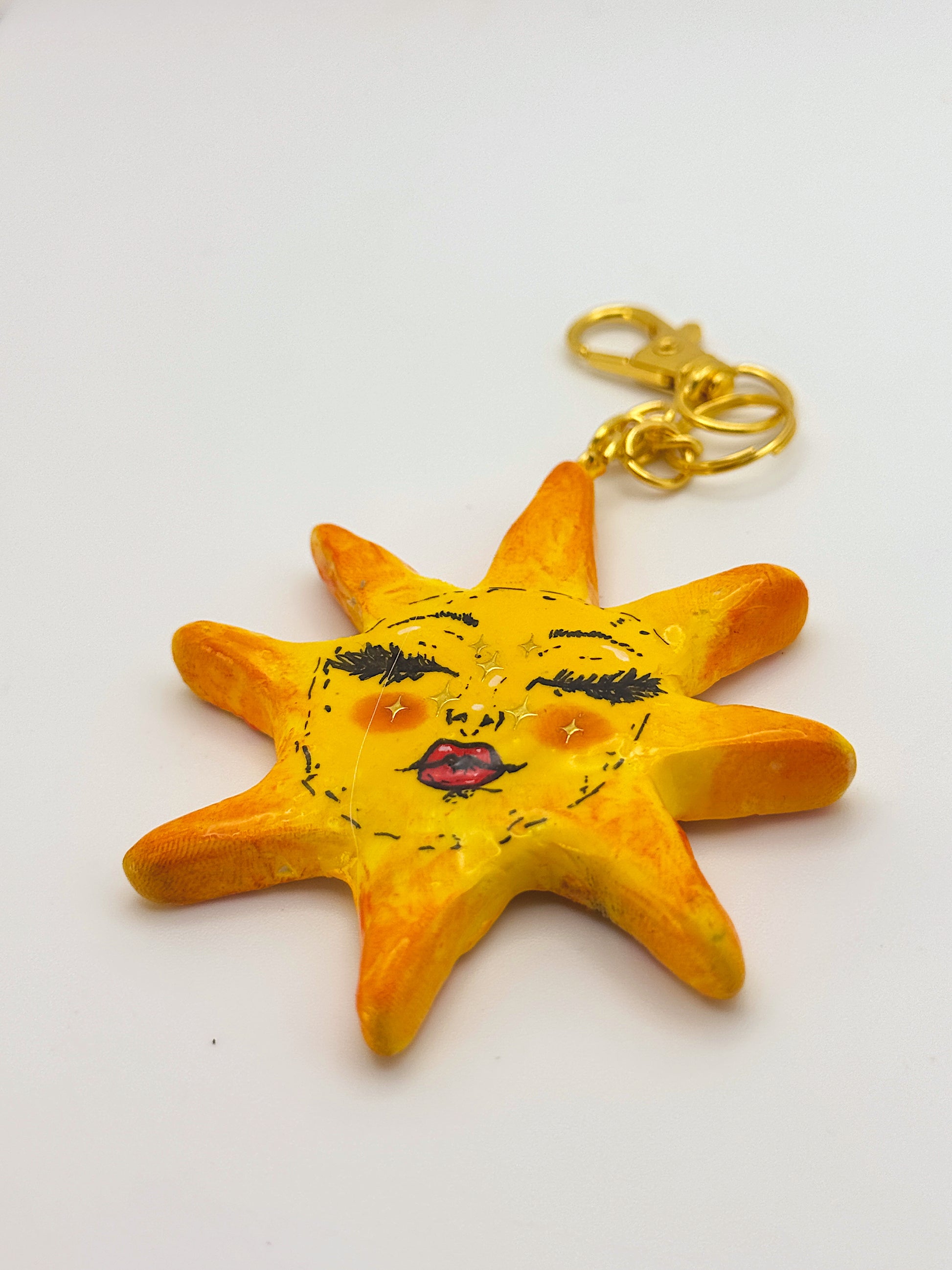 This flirty sun keychain is hand-sculpted from polymer clay, painted with warm yellows + oranges, and sealed in glossy UV resin for durability and shine. Each one has her own sassy expression — bold lashes, starry cheeks, and kissy lips — giving major celestial it-girl energy.