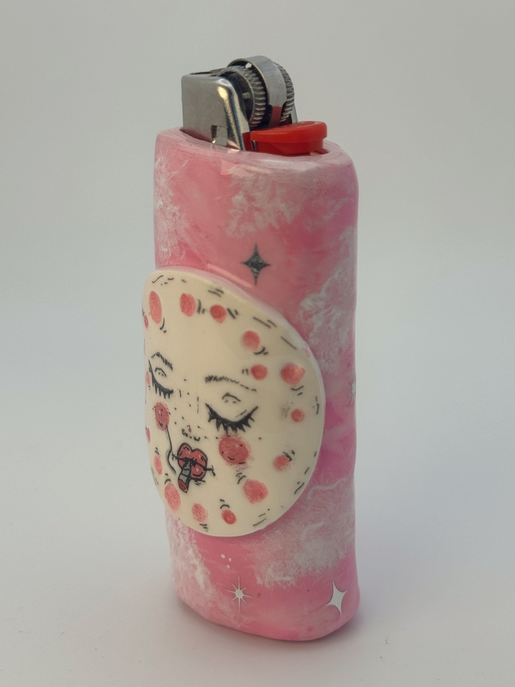 This piece is sculpted and detailed by hand, wrapped around a standard Bic lighter and sealed for durability. The soft pink marbled background paired with the sleepy, blushing moon gives it that dreamy 90s celestial energy with a little rebellious twist.