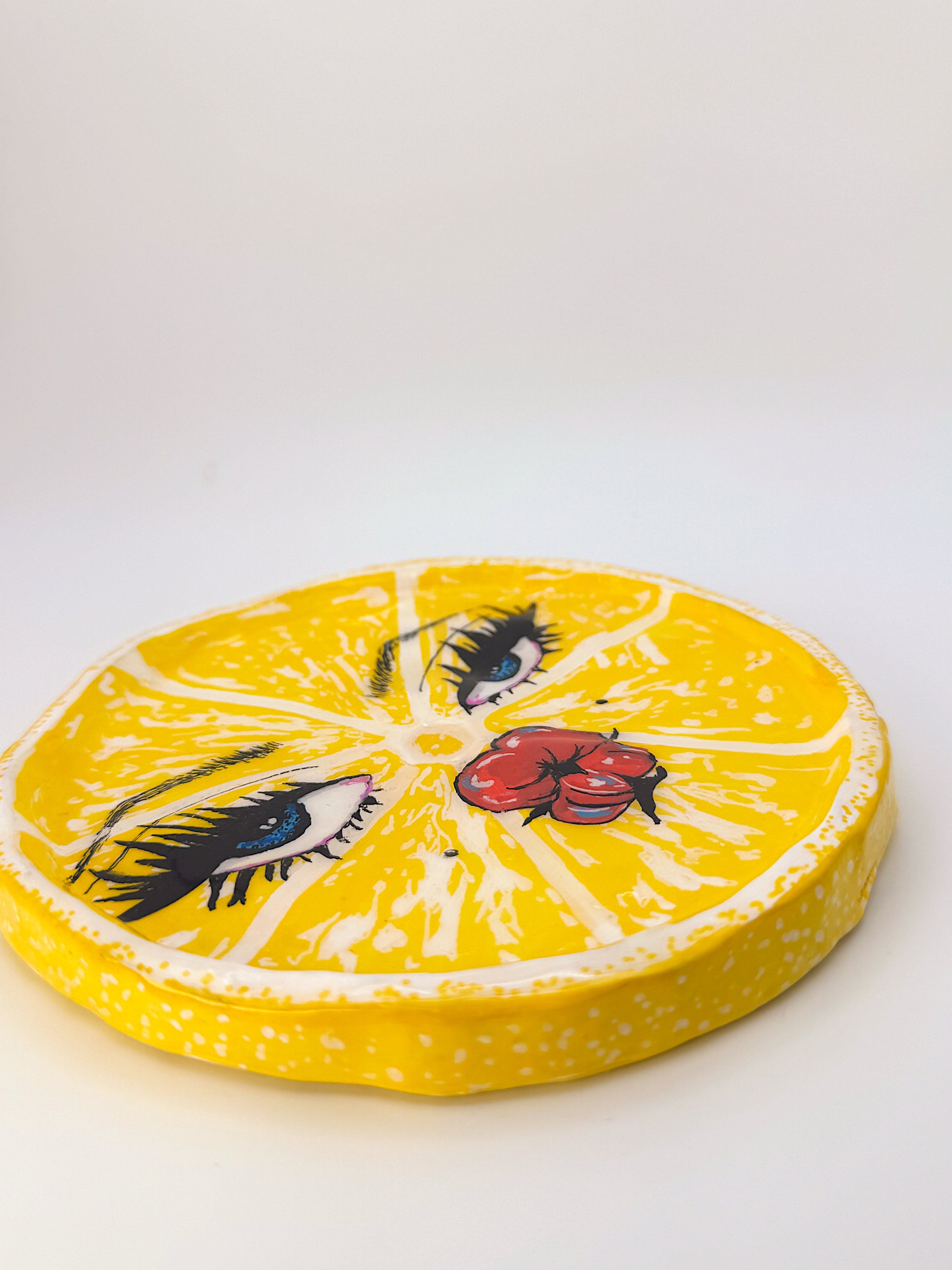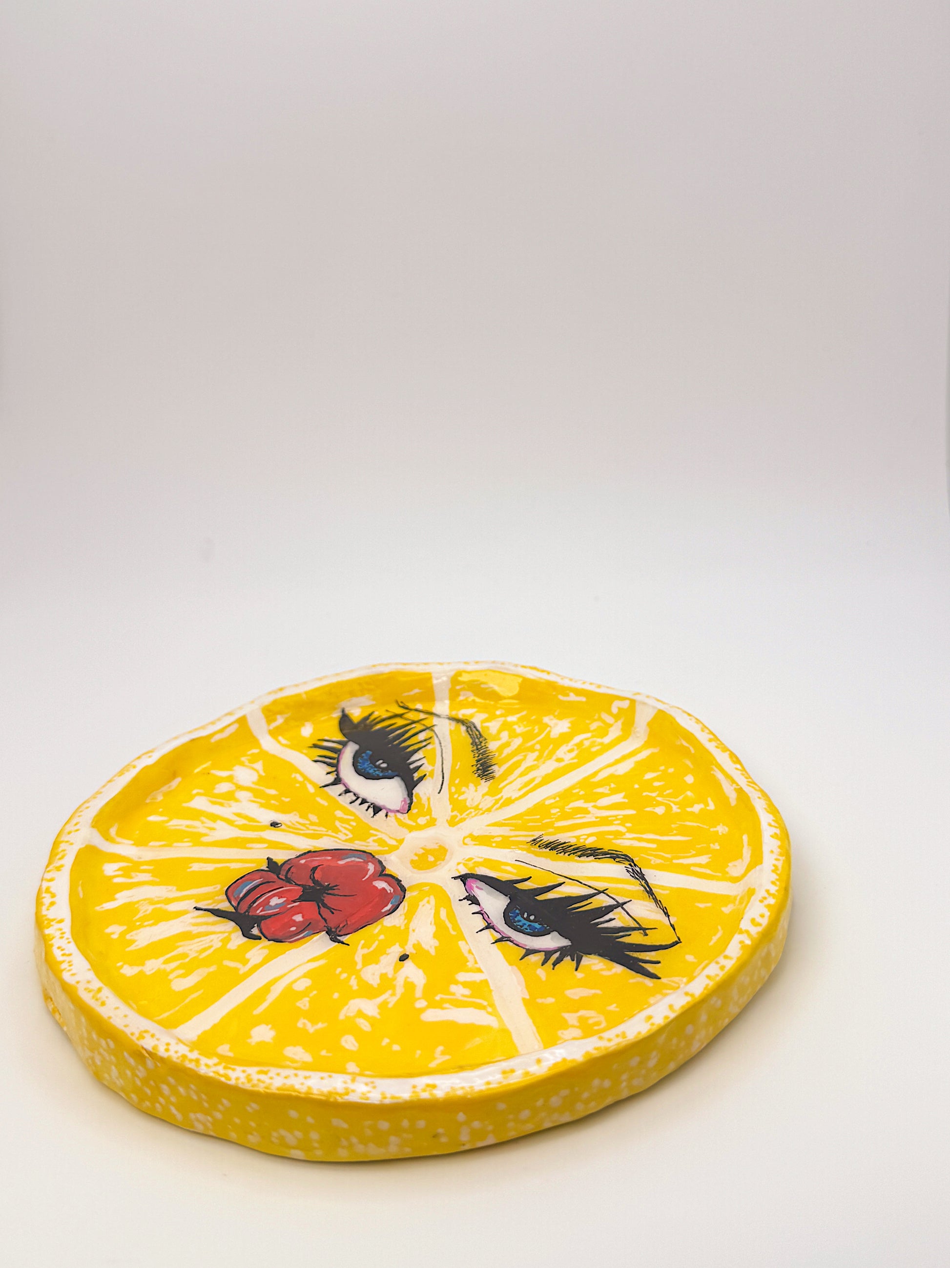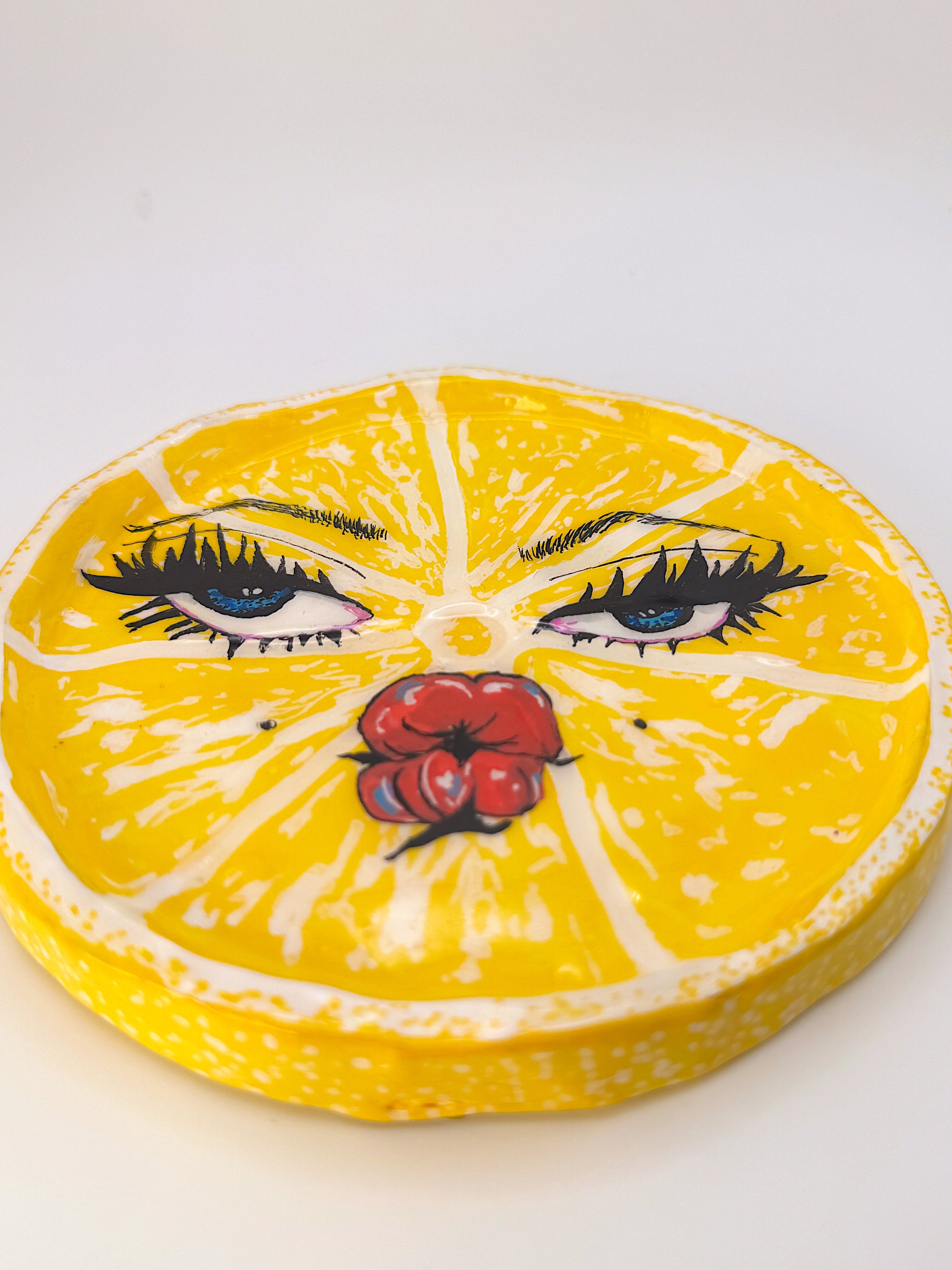 A one-of-a-kind 6 inch hand-sculpted lemon slice trinket dish (or ashtray) with the sassiest puckered face you’ve ever seen. Every single detail — from the rind texture to the lashes, lips, highlights, and citrus specks — is sculpted, painted, and detailed by hand.