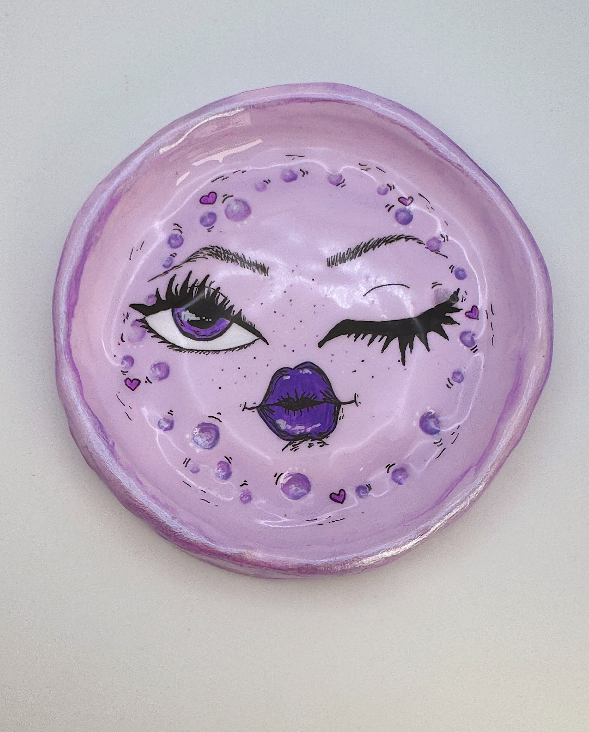 A playful and dreamy winking moon trinket dish handcrafted in a soft light purple shade and finished with small heart accent details. This crescent moon features a cheerful winking expression, giving it a whimsical personality while still serving as a functional catch-all.