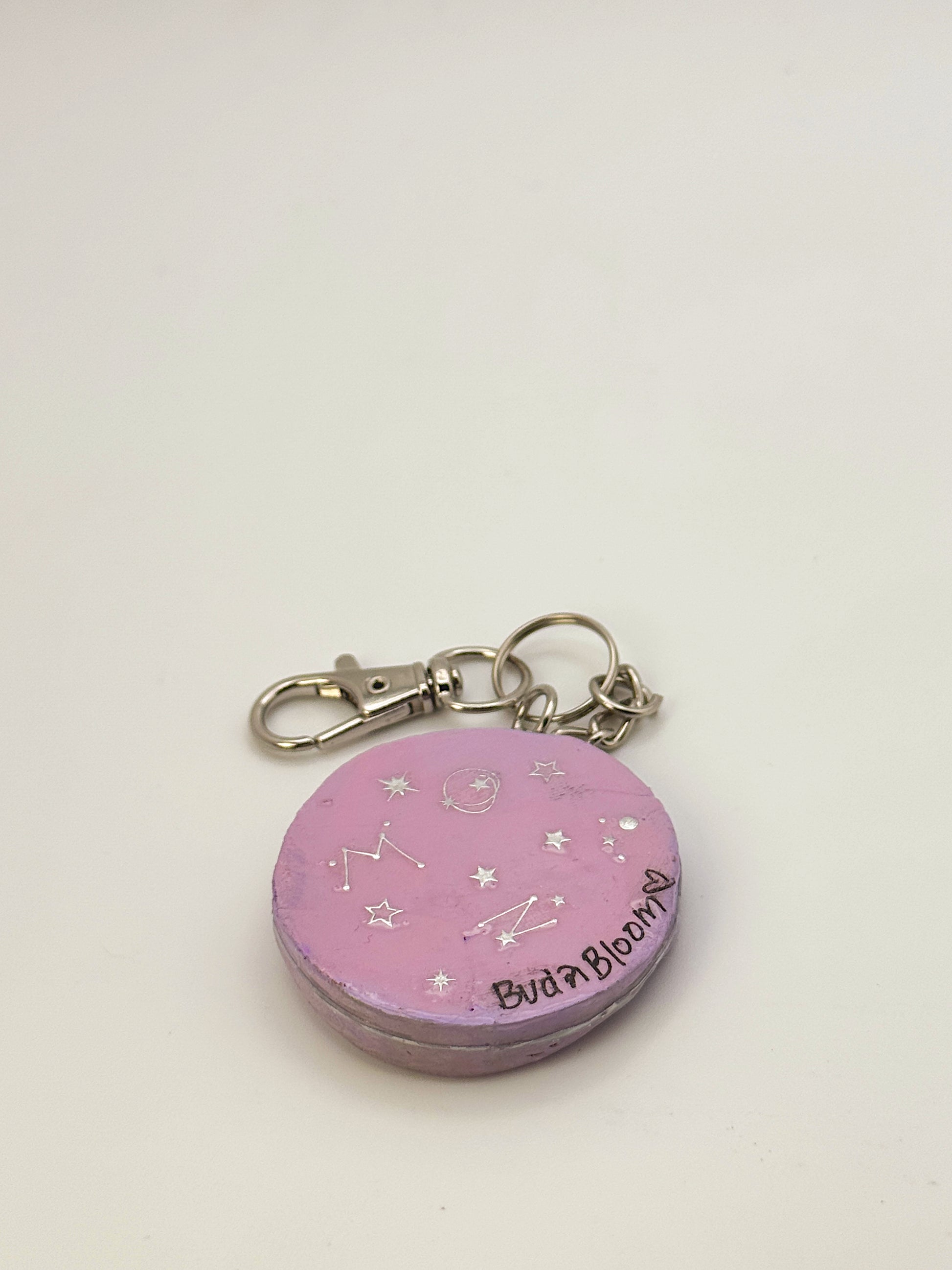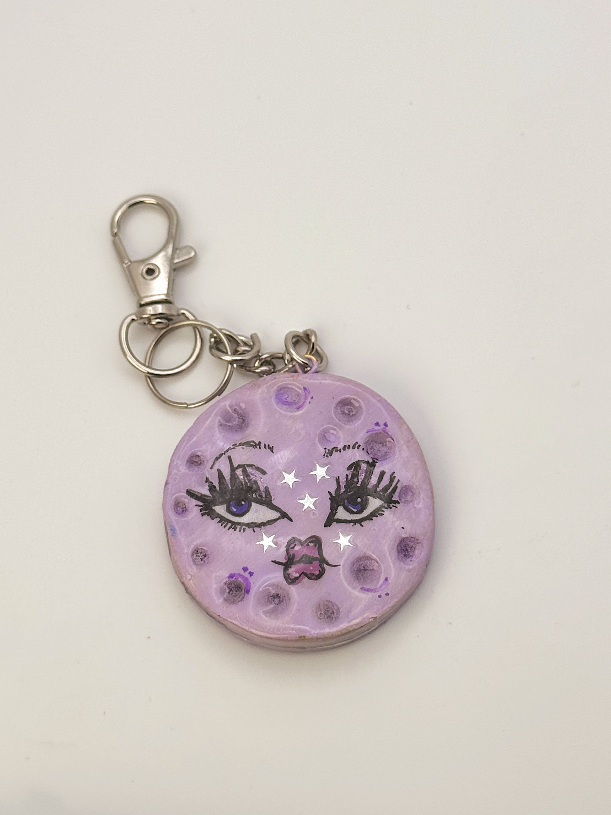 This hand-sculpted mini moon keychain is made from polymer clay, painted by hand, and sealed glossy for durability. Each one has her own personality, with dreamy lashes, tiny stars, and hand-painted crater details. She’s lightweight, sturdy, and perfect for keys, backpacks, purses, or hanging in your car.