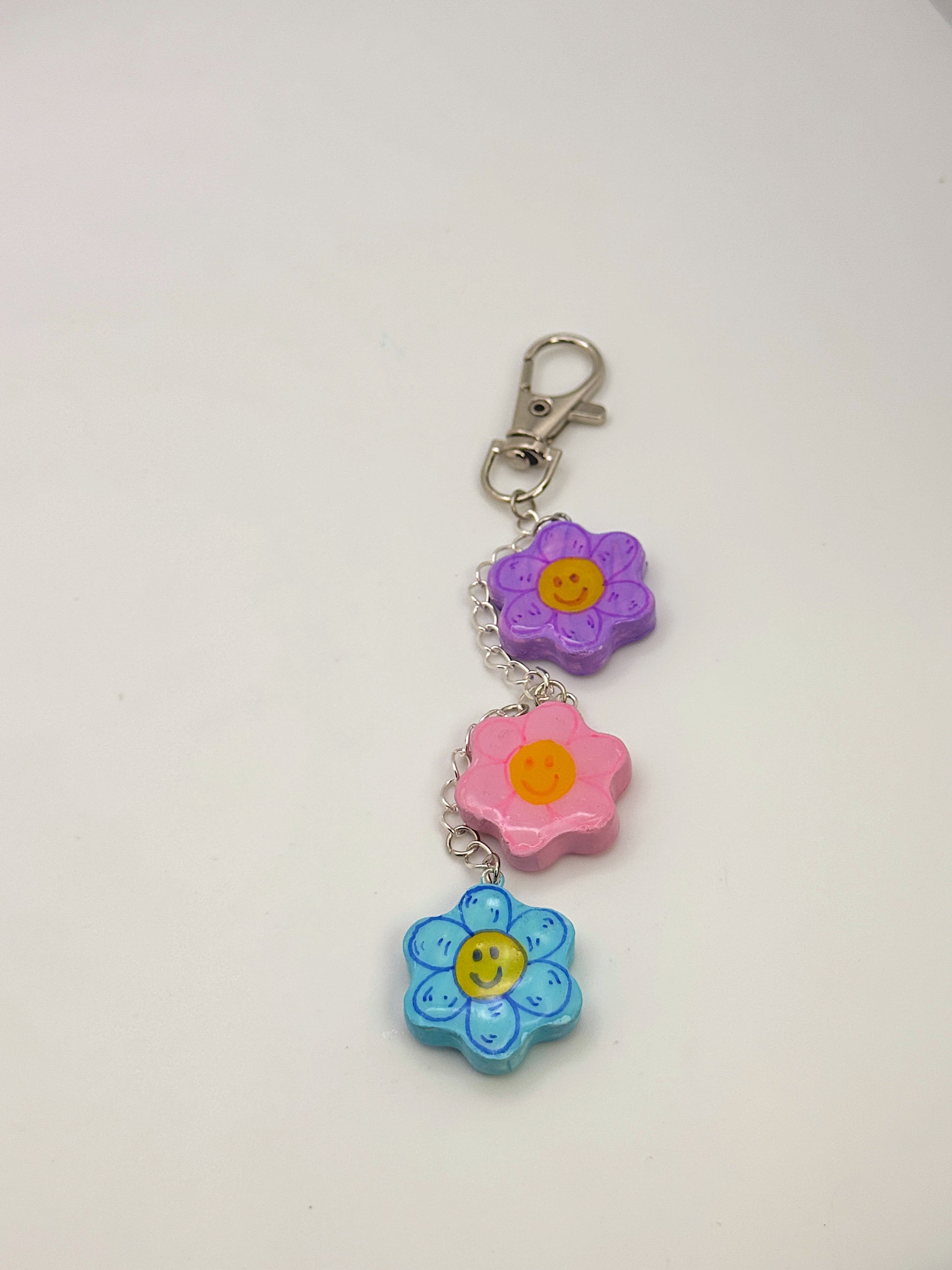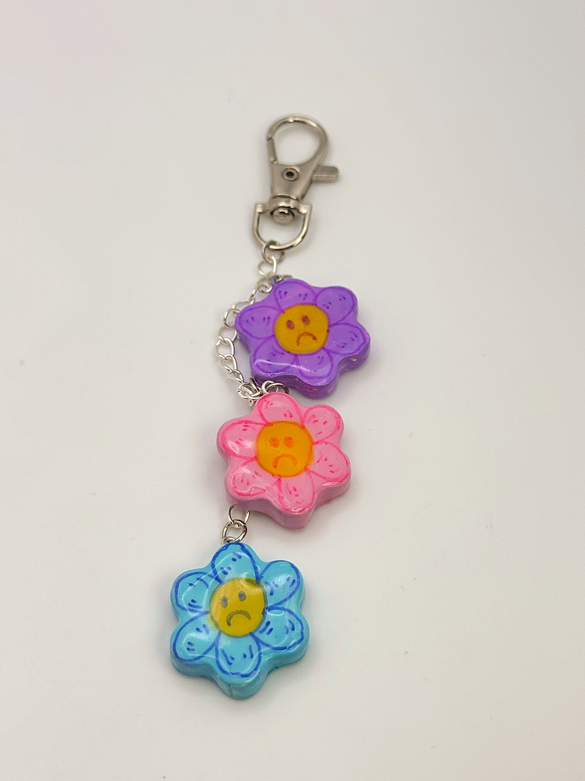 This Moodswing flower keychain and bag charm features three hand-painted flower charms, each with a different expression — happy, frowny, and somewhere in between. It’s a playful nod to emotional range, changing moods, and the fact that feelings don’t come in just one flavor.