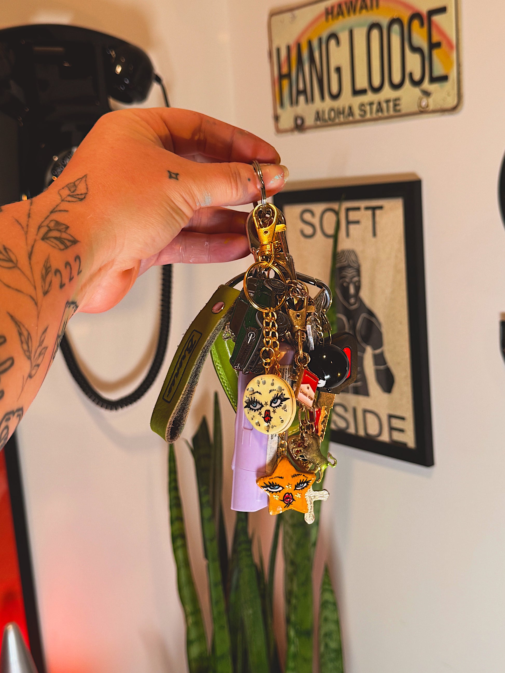This handmade Moon + Star keychain is sculpted from polymer clay, hand-painted, and sealed for durability. Each charm has its own little personality — pouty lips, flirty lashes, and a whole lot of attitude.