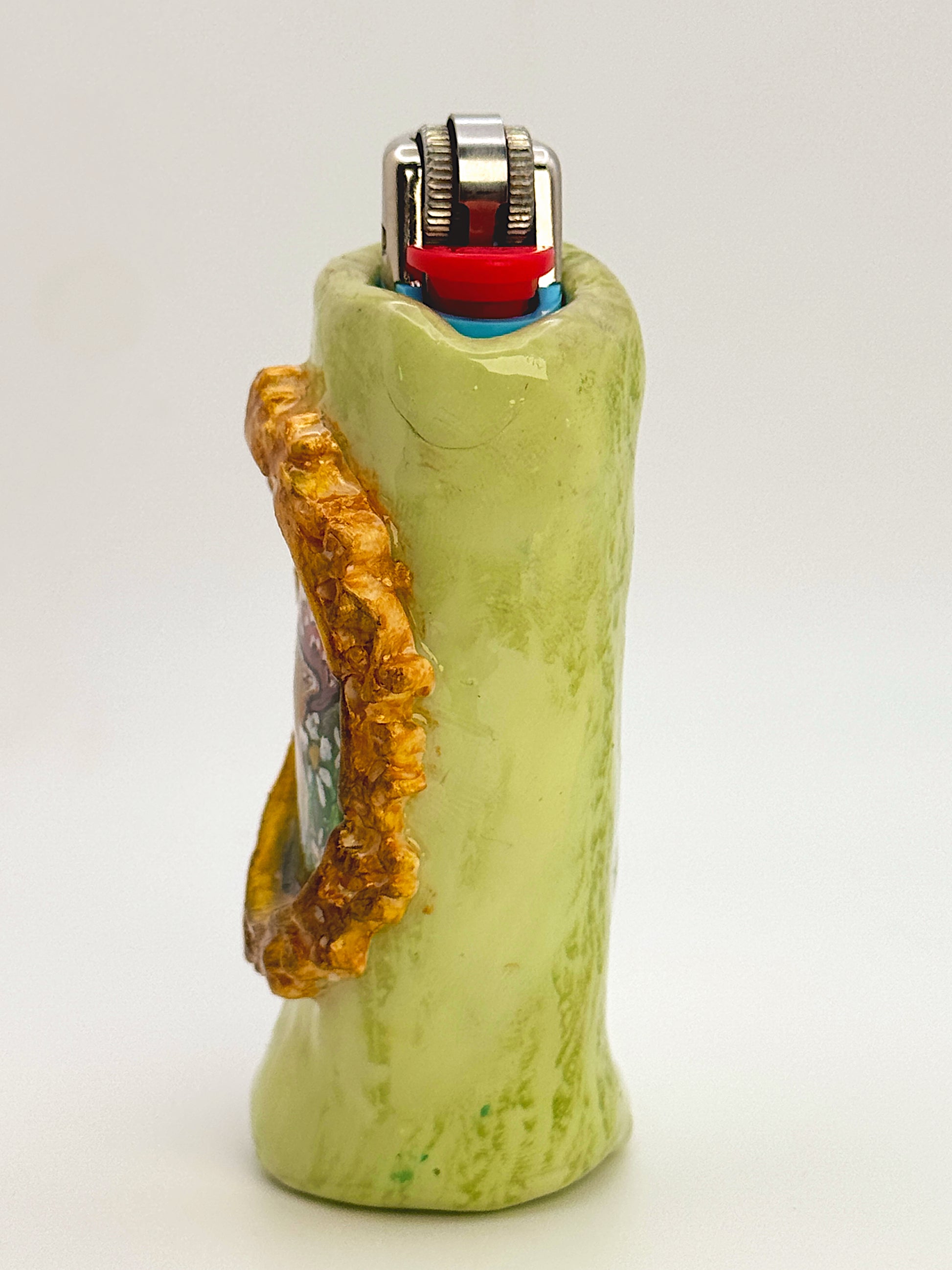 The rest of the lighter case is finished in a mossy green tone with organic texture, giving it an earthy, forest-inspired feel. Each detail is painted by hand and sealed for durability, making this both a functional accessory and a tiny piece of art.