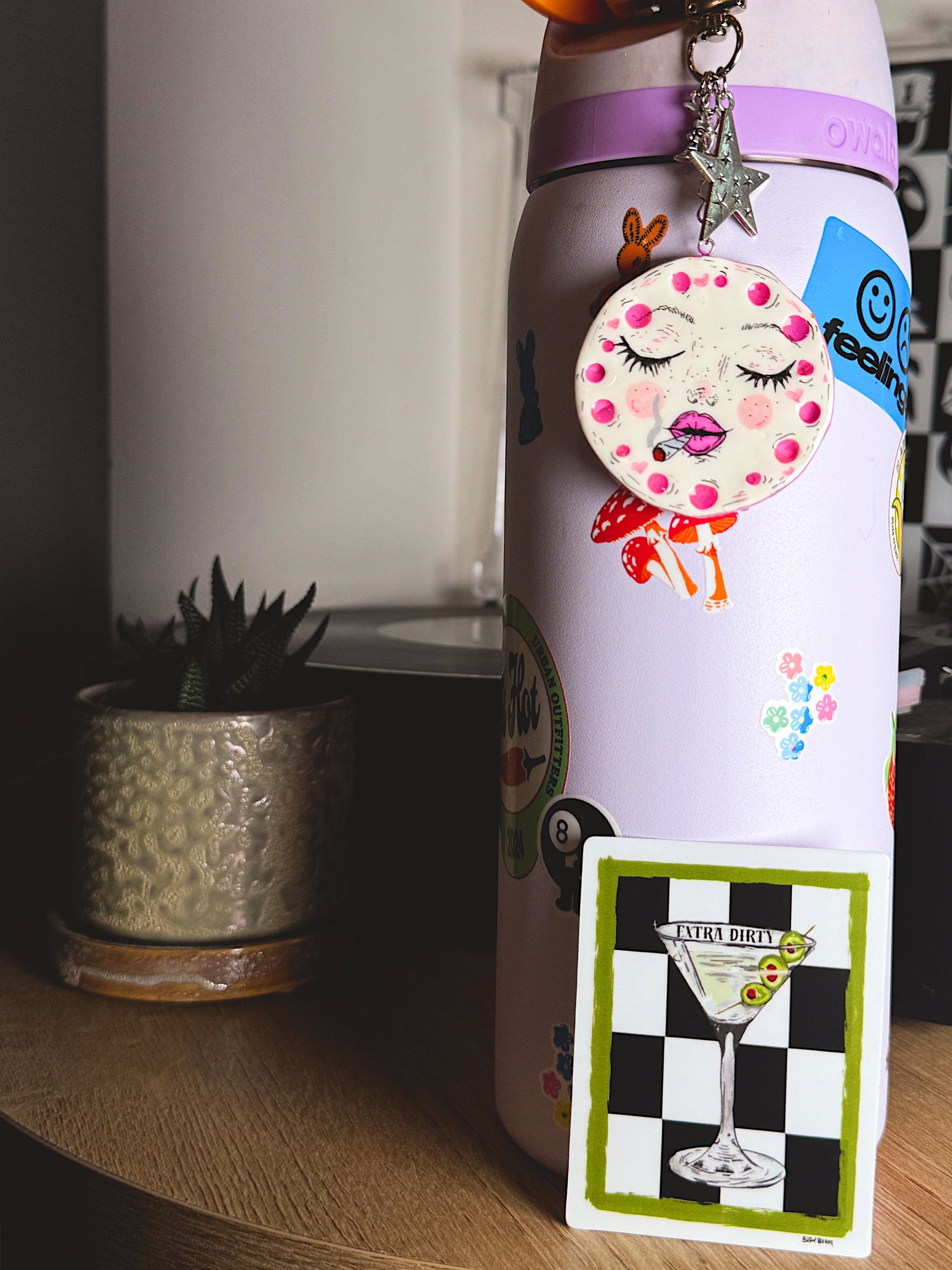 Bring bold cocktail energy to your everyday essentials with this Extra Dirty Martini vinyl sticker. Featuring a hand-illustrated martini glass with olive garnish on a classic black-and-white checkerboard background and a hand-painted green frame, this design is perfect for martini lovers and maximalist decor fans.