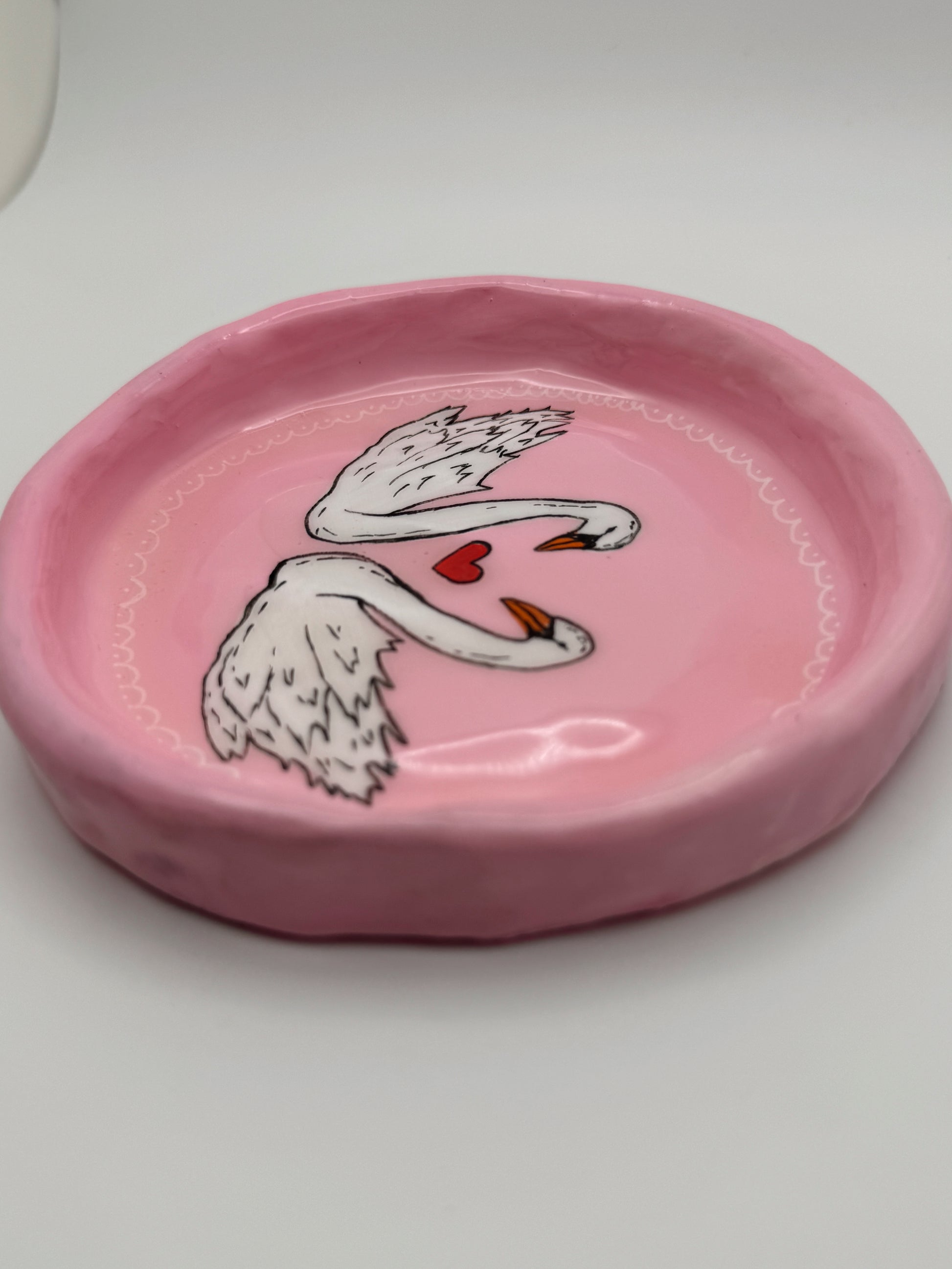 Pink Swan Love Trinket Dish – Hand-Painted Polymer Clay Jewelry Catchall (4.5”)