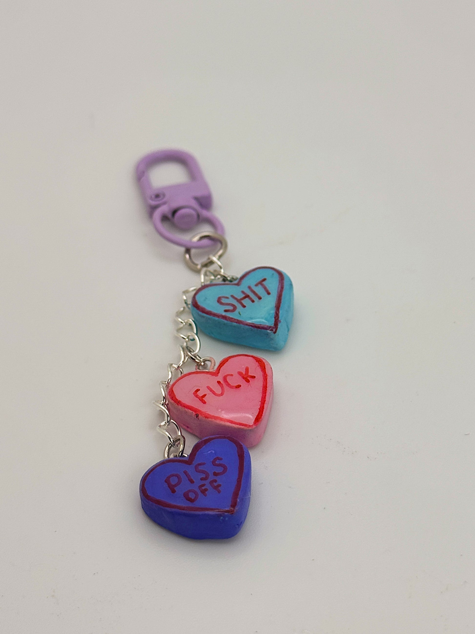 A bold, no-filter twist on classic conversation hearts, this sassy bag charm features three statement hearts that read “shit,” “fuck,” and “piss off.” Finished with a vibrant purple clip, this piece is made for anyone who likes their accessories unapologetic, funny, and full of attitude.