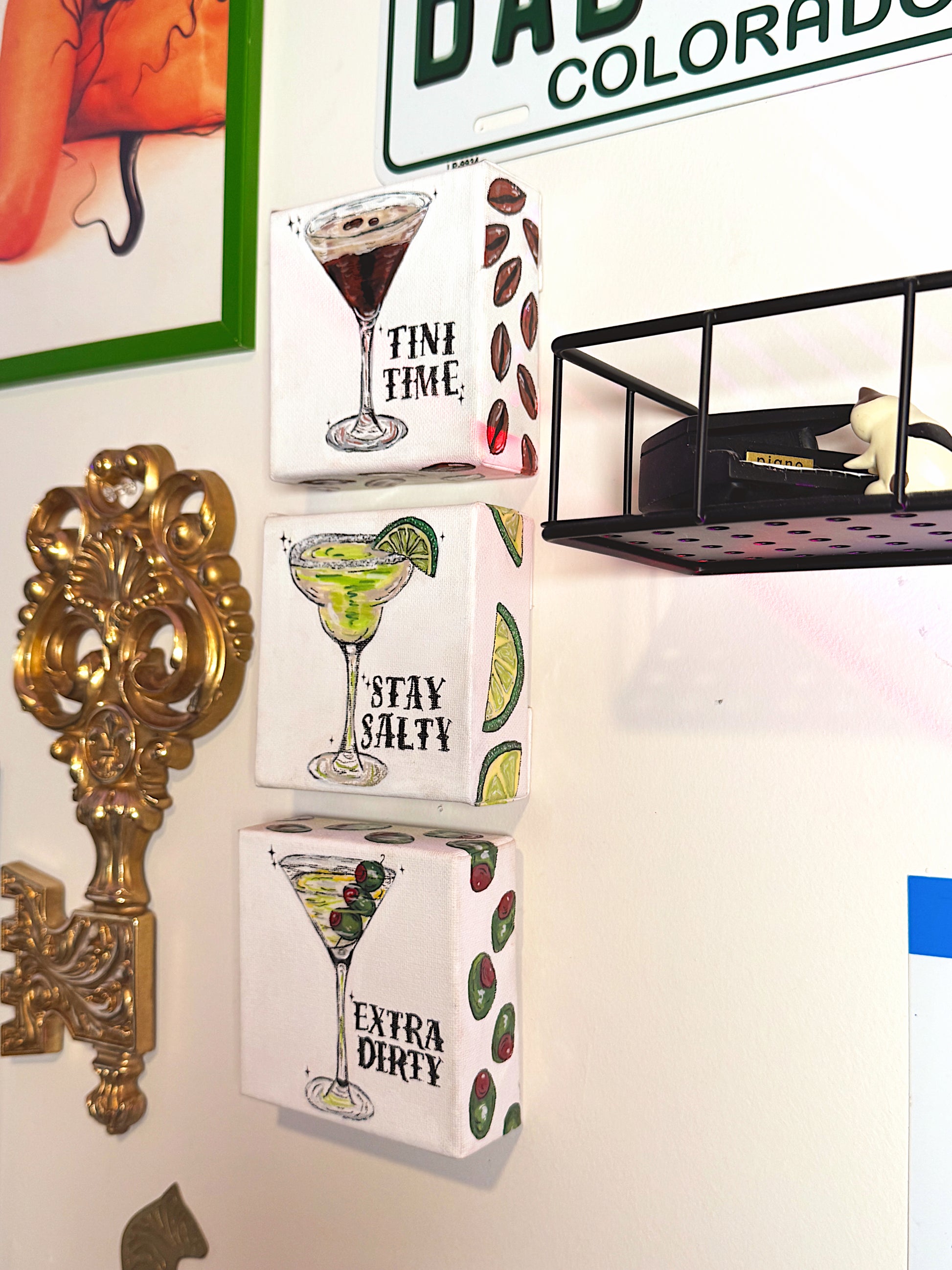 Each Mini Cocktail Canvas is an original, hand-painted 4×4 inch acrylic painting inspired by classic cocktails and bar-top energy.