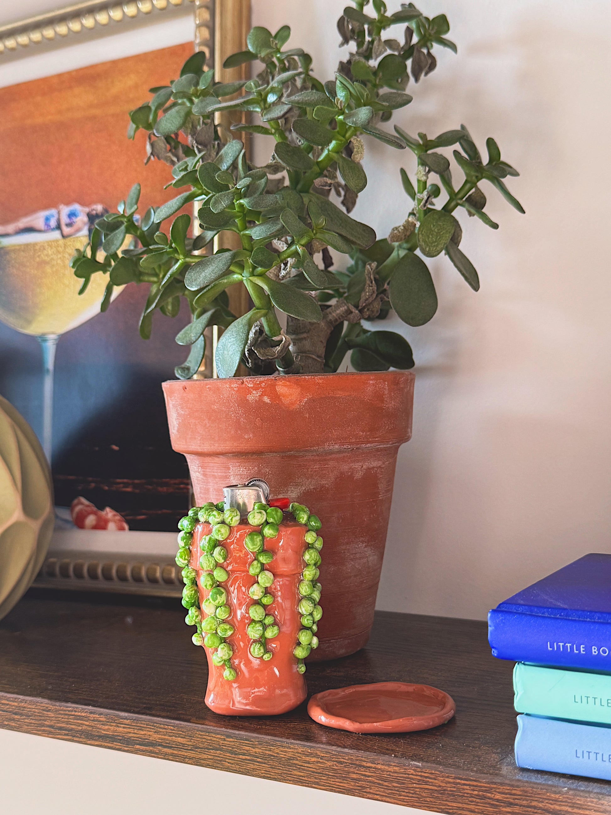 This String of Pearls Lighter Case is fully handmade from polymer clay and sealed with a glossy UV resin for durability and shine. Inspired by real trailing succulents, each pearl is individually sculpted and painted to mimic the look of a living plant cascading over a terracotta pot.