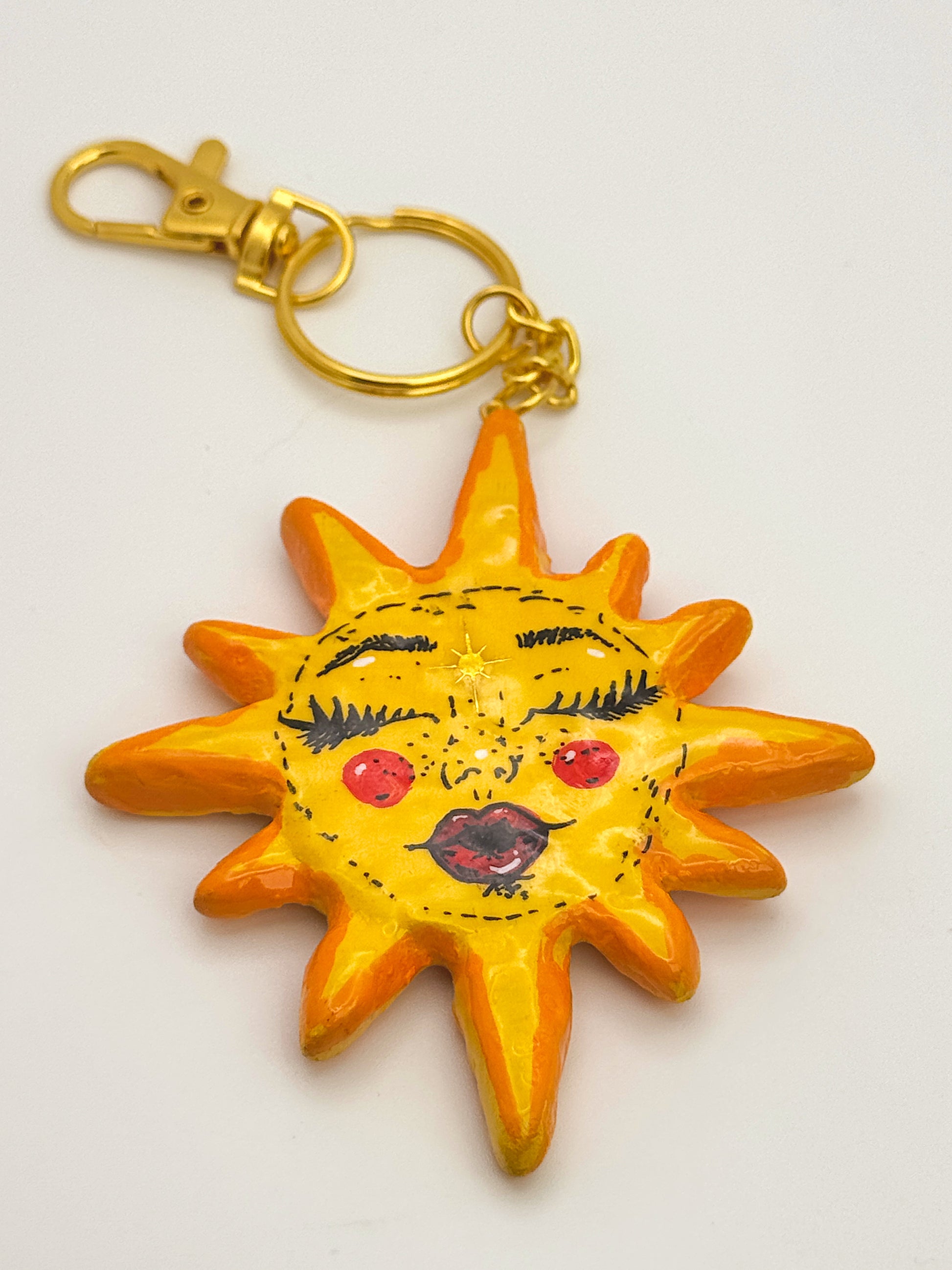 This hand-sculpted Sun Goddess keychain is made from polymer clay, painted entirely by hand, and sealed glossy for a sun-kissed glow. She features a fiery orange fade, fluttery lashes, rosy cheeks, and star accents that catch the light. Finished with a gold lobster clasp so she looks luxe on any set of keys, bag, or backpack.