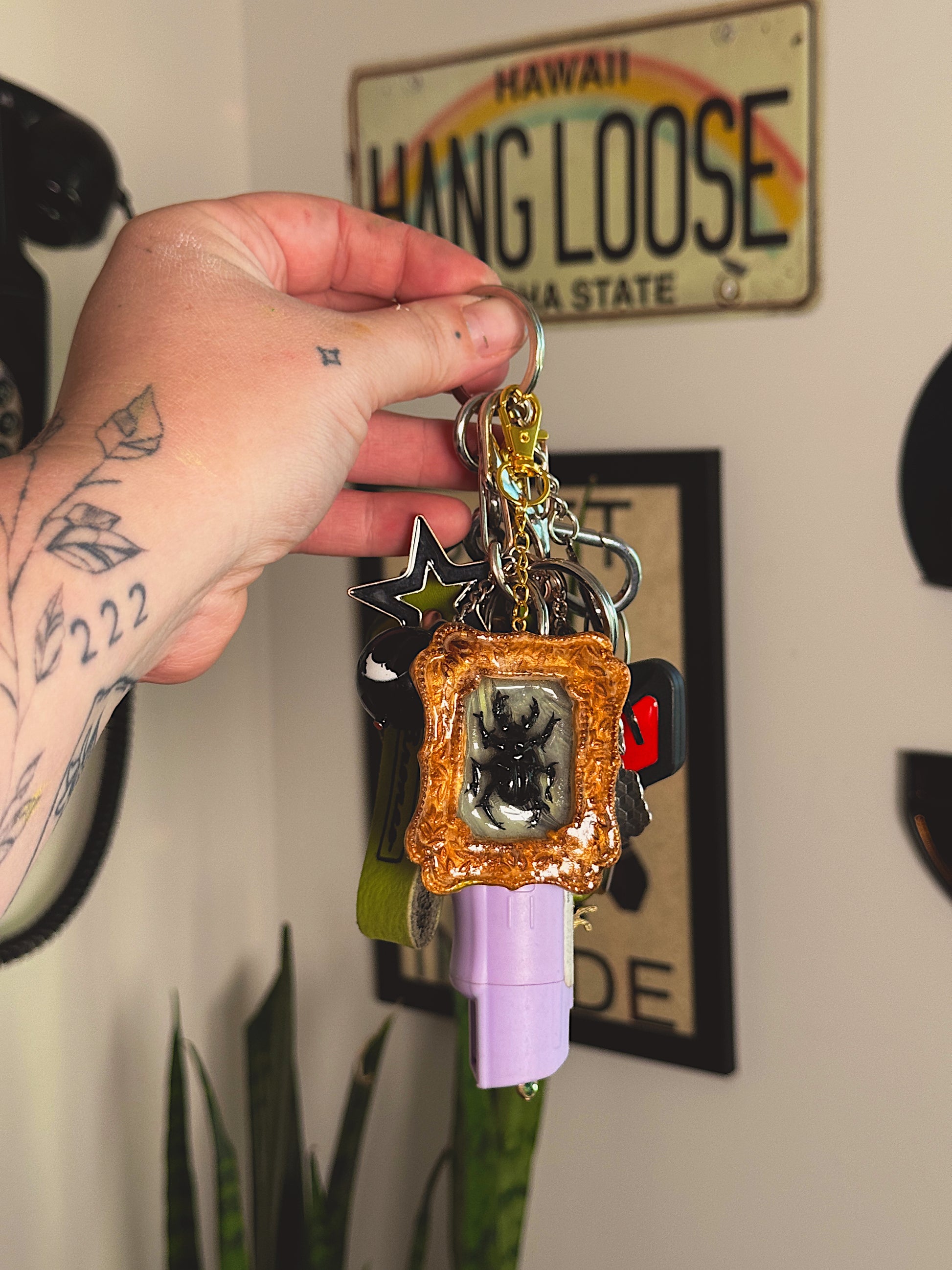 This one-of-a-kind keychain features a hand-sculpted vintage-style frame encasing a raised beetle, sealed beneath a glossy resin finish. Inspired by old-world curiosities and oddity collections, this piece is designed to feel like a tiny framed specimen you can carry with you.