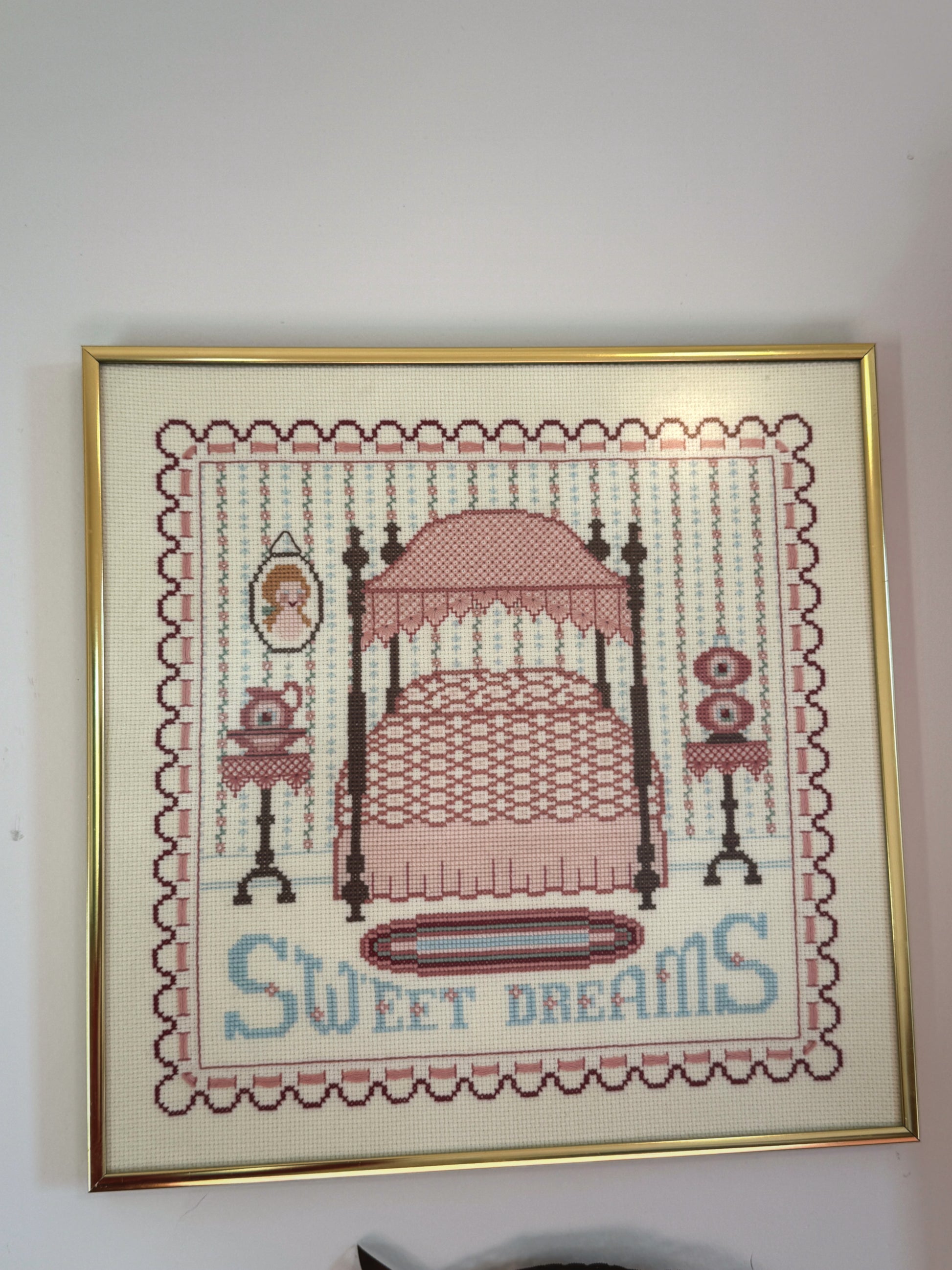 Charming vintage needlepoint wall art featuring a cozy canopy bed scene and the phrase “Sweet Dreams.”
