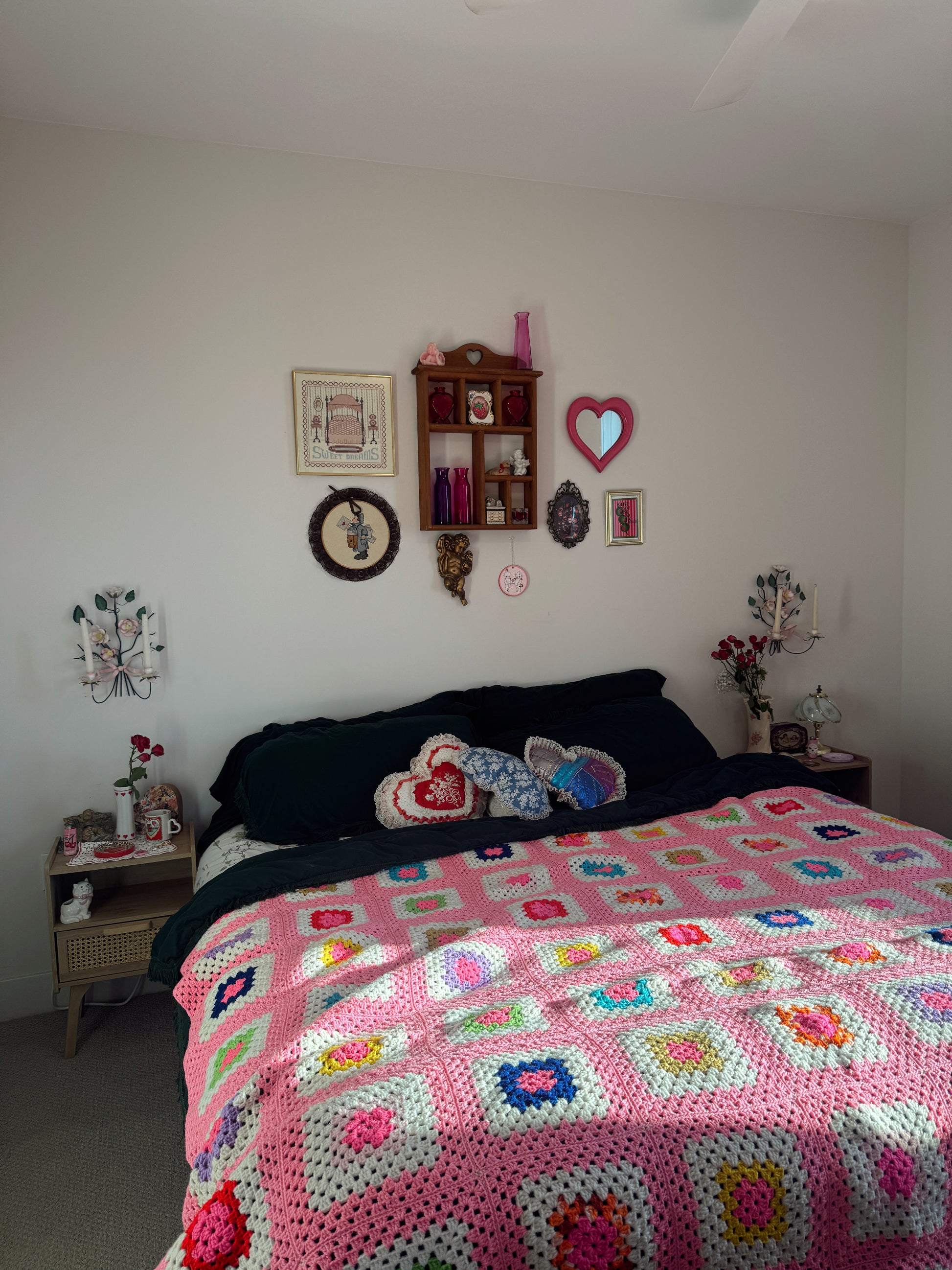 A sweet and nostalgic textile artwork that adds warmth and storybook charm to any room.