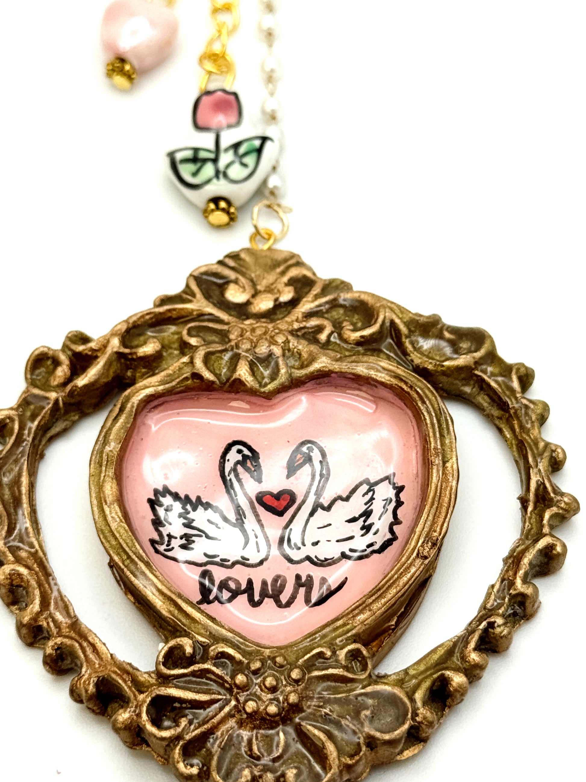 This vintage-inspired heart frame bag charm features a hand-painted swan illustration inside an ornate gold-toned heart frame, finished with playful dangling charms and a heart-shaped clip.