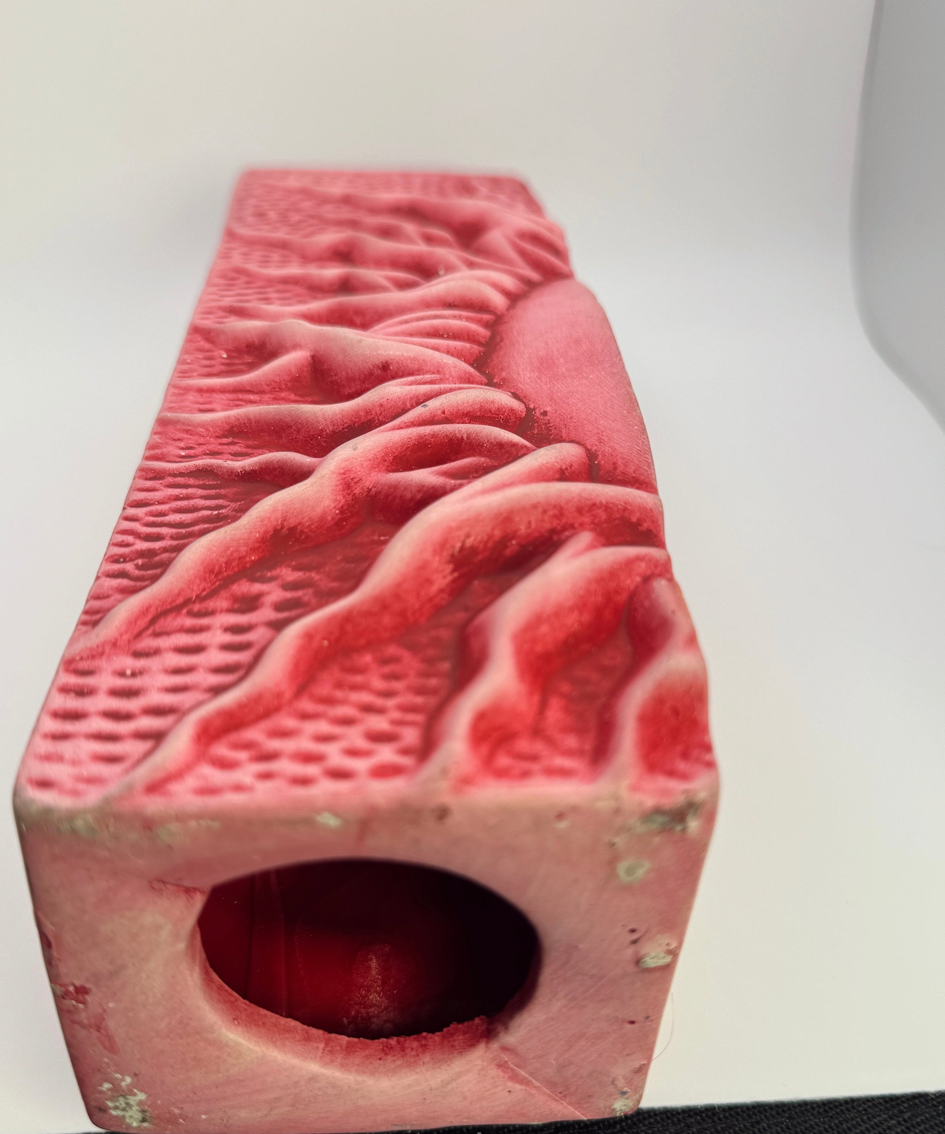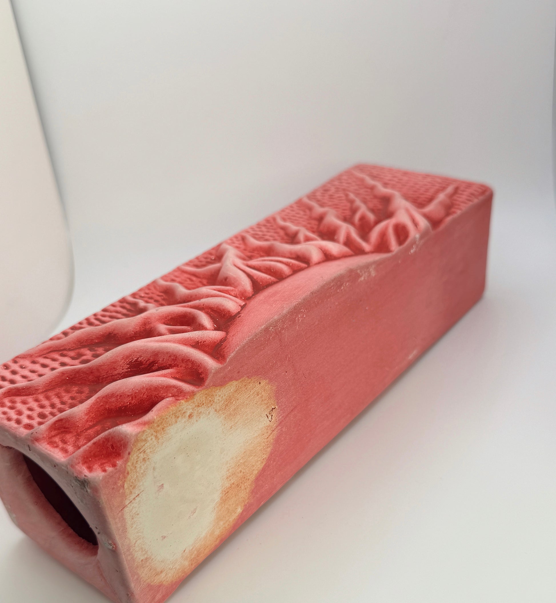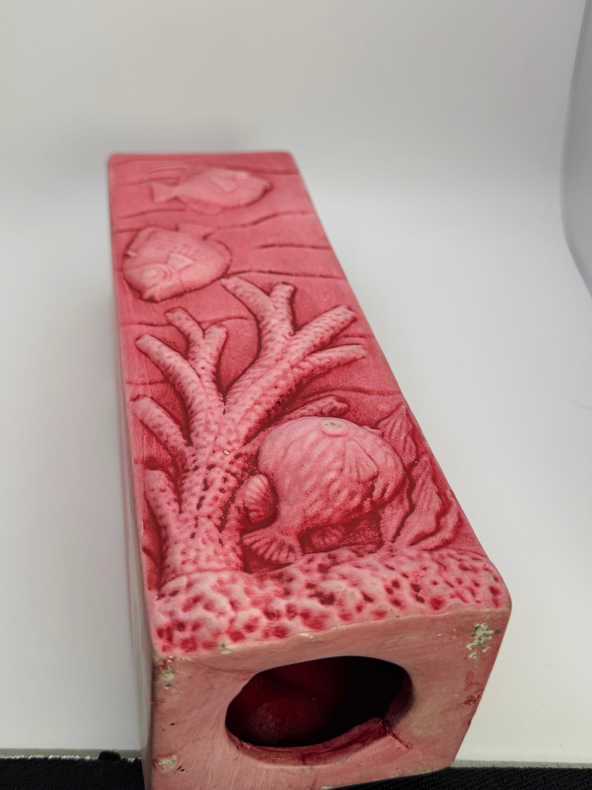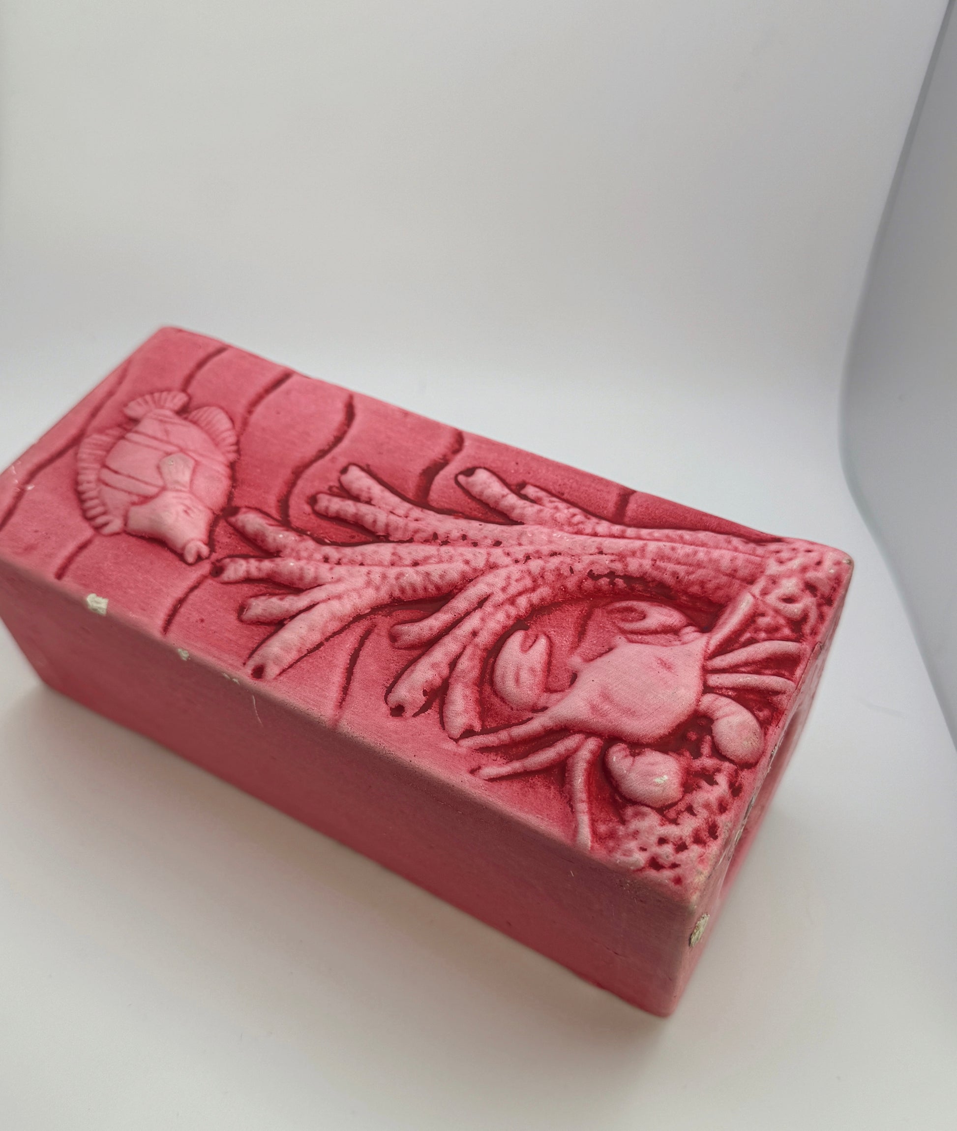 Finished in a dusty rose/pink glaze with raised, tactile details, these have the nostalgic, slightly surreal charm characteristic of 90s decorative ceramics.
